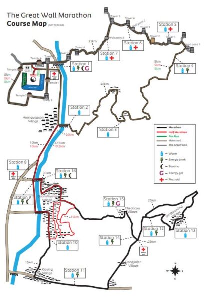All distance events in The Great Wall Marathon start from Yin and Yang Square in the old Huangyaguan fortress and begin along the same route. Immediately reaching Jinwei Highway, the route leads south for 1km before turning left on to Changcheng Highway. At this point, you are on the road leading to the Great Wall entrance and will face a 4km uphill climb. After completing the first 5km of your respective distance, you will meet the first of many steps! The next 3km are run on the Great Wall of China itself, including 1km around the magnificent fortress walls. Just before the 7km mark you face a 700m long section with a steep descent on the infamous “Goat Track”.